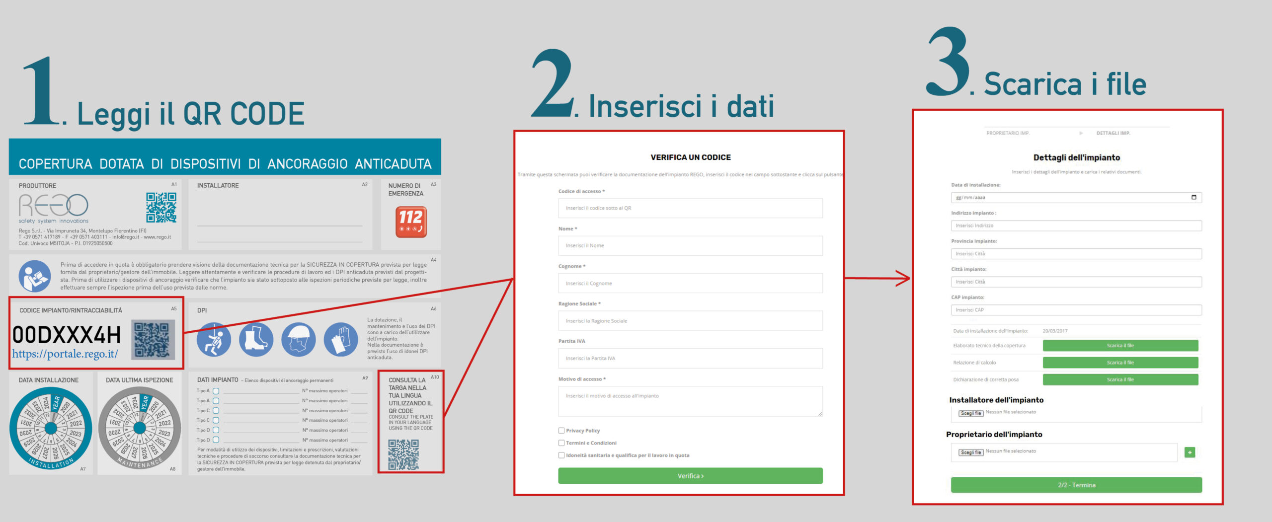 Abbiamo studiato ogni singolo passaggio per rendere DO.C semplice, intuitivo ed efficace. Al termine di una installazione, la targa DO.C fornita da REGO, va appesa in prossimità del punto di accesso, sulla copertura.