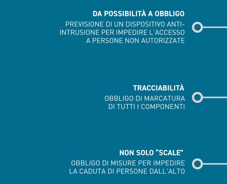 Accesso controllato, chiusure di sommità, sdoppiamenti, piattaforme intermedie, protezione delle aree di sbarco, tutti aspetti affrontati in modo preciso nella nuova normativa. Si riducono le interpretazioni sulla sicurezza e si punta ad una corretta progettazione di questi importanti sistemi di salita.